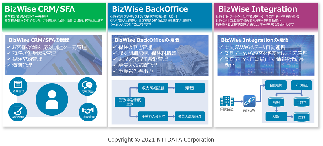 「BizWise®」は株式会社NTTデータが保険代理店向けに展開する「WiseOffice®」ブランドの1つであり、主に企業系代理店向けに豊富な機能を取り揃えています。DTSでは、「BizWise®」導入のご相談から、開発・運用までをワンストップで支援いたします。