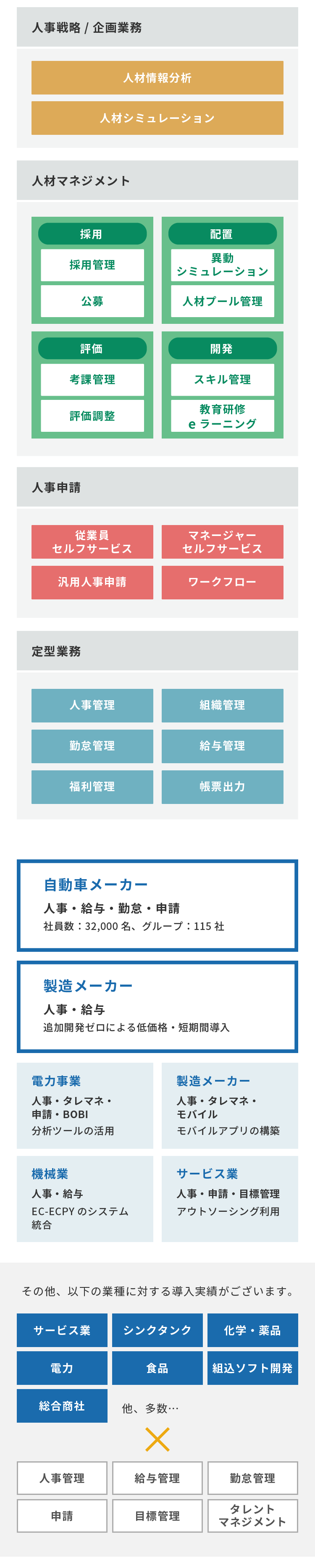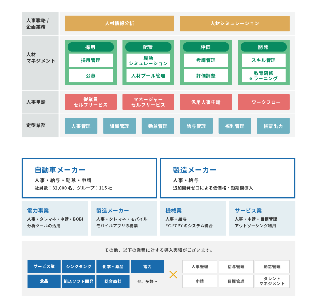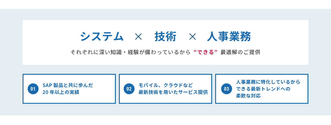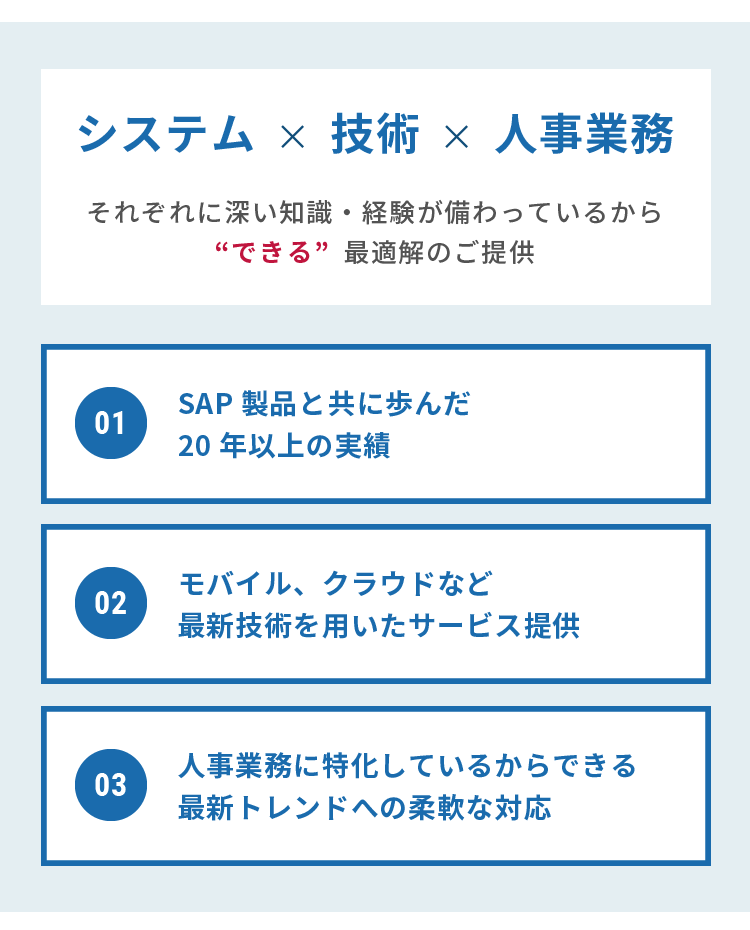 - SAPを軸とした人事・給与・勤怠等人事システムに関する豊富な実績を元に最適な導入をご提案いたします。