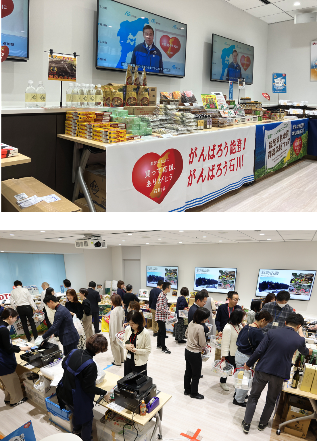 DTSは2024年の能登半島地震および豪雨の復興支援を目的に、石川県の「応援消費プロジェクト」に賛同し、本社にて石川・能登物産展を開催しました。石川・能登の特産品80品目以上が並び、役員・社員だけではなく、当日来社されたお客様にも購入いただき、被災地の支援に協力しました。
