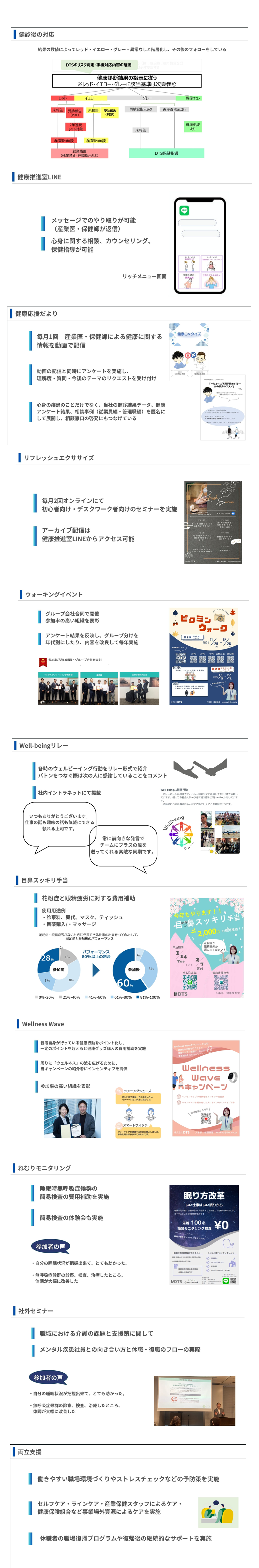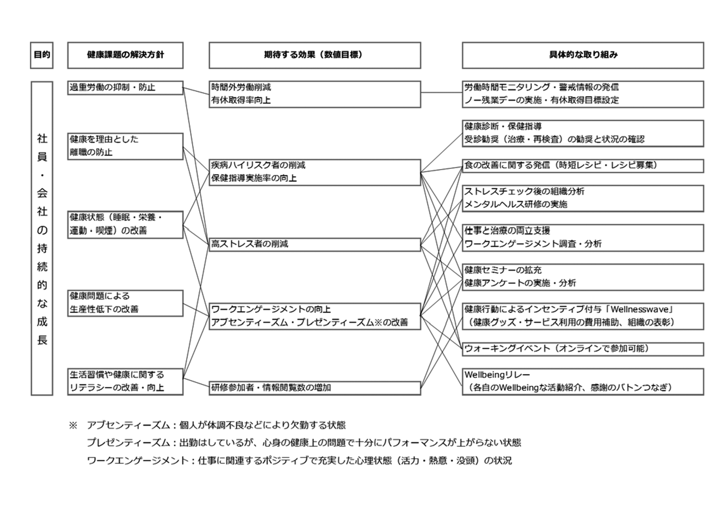 健康とは、単に病気がない状態ではなく、心身ともに満たされ、社会的に良好な状態であることです。それを維持していくための持続可能な取り組みをおこなっていきます。(取り組み例)