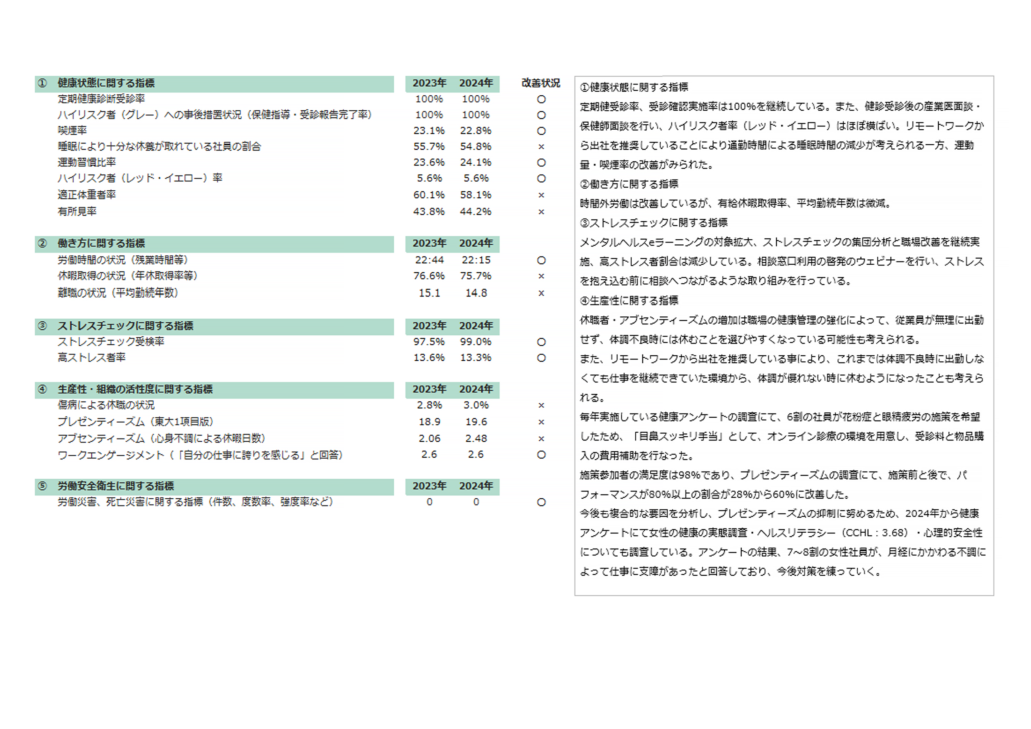 取り組みについての実施状況を評価し、効果の確認、計画の改善を繰り返していきます(健康経営の取り組みに関する指標)。